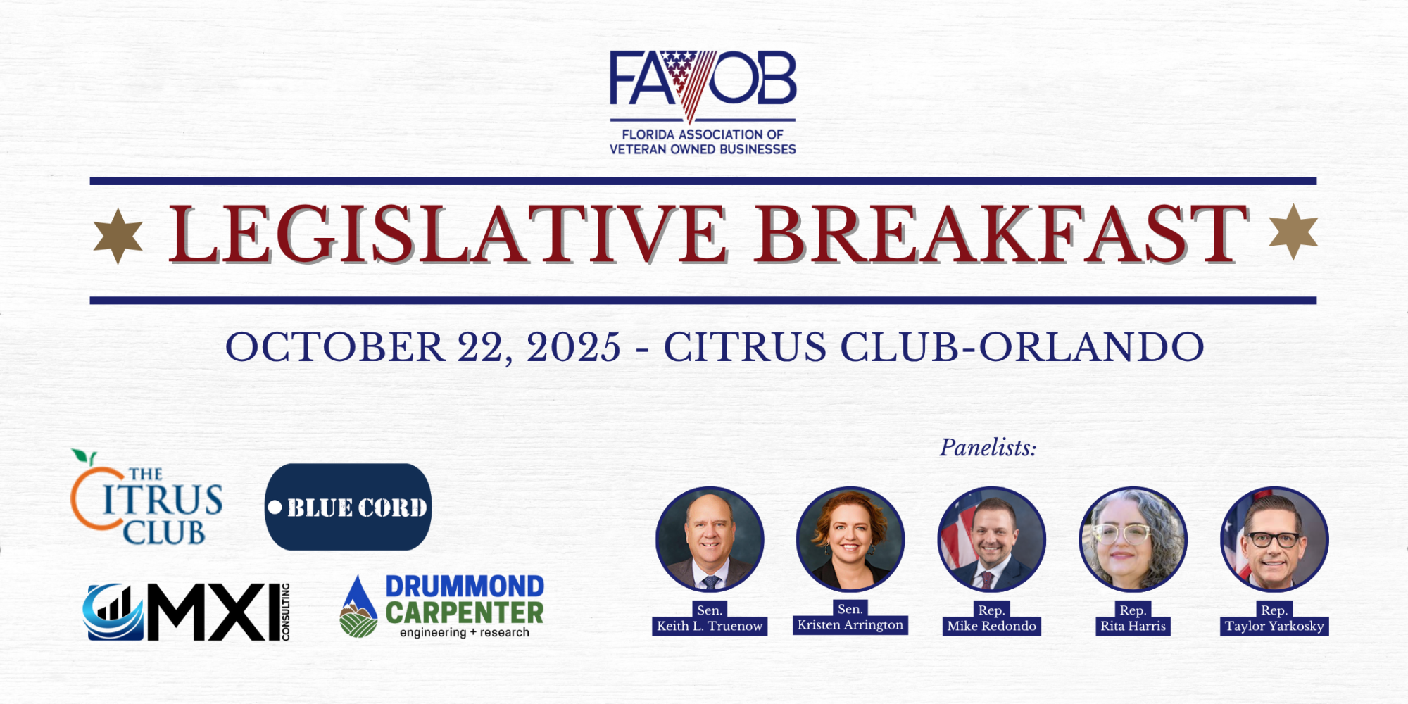 Join the Florida Association of Veteran-Owned Businesses (FAVOB) for our annual Legislative Breakfast, a signature advocacy event uniting veteran business owners, corporate leaders, and policymakers to strengthen the voice of Florida’s veteran entrepreneurs.